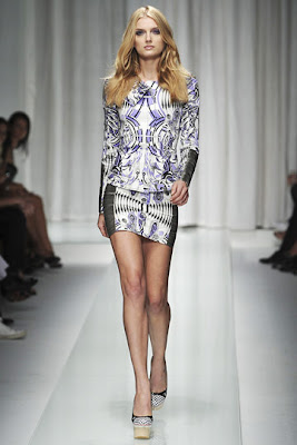 Abbey LeeVivid pastels, geometric prints, baroque curlicues, short-short skirts, and slinky, sexy chain mail: Where else could this be but Versace? For Spring, Donatella Versace was telling everyone who went backstage that she'd been inspired by Tim Burton's Alice in Wonderland (which comes out next March).